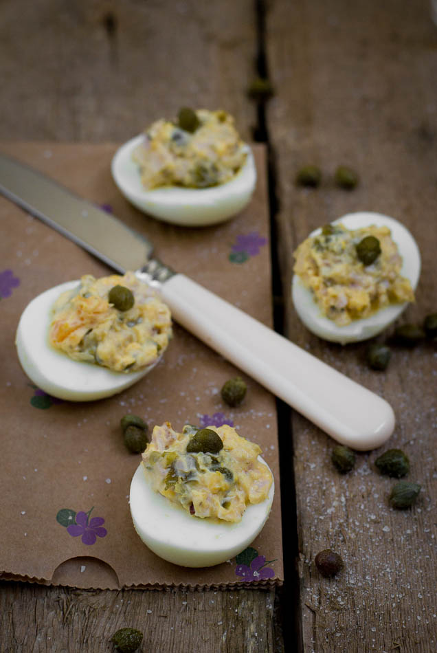 Poolita munad ja eemalda kollased. Sega munakollased hakitud kapparite, peeneks hakitud singi, majoneesi ja mädarõikaga. Vajadusel maitsesta soola ja pipraga ning kui segu tundub liiga paks, lisa majoneesi. Täida munad seguga.